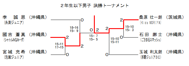 | 2BS-4 | Kids MORIYA[茨城県] | 桑原壮一朗 | 2 | 15-10 15-11 | 0 | 玉城利太朗 | 那覇Jr.BC[沖縄県] | |