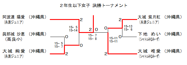 | 2GS-2 | 糸満Jr.[沖縄県] | 大城紫月紅 | 2 | 15-13 15- 6 | 0 | 下地 めい | シャトルみなみーず[沖縄県] | |