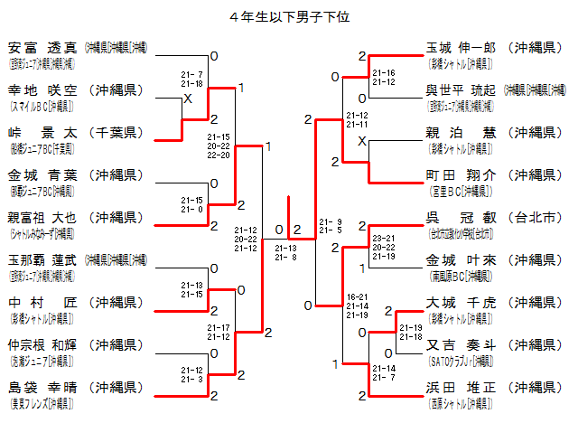 | 4BK-4 | シャトルみなみーず[沖縄県] | 親富祖大也 | 2 | 21-15 21- 0 | 0 | 金城 青葉 | 那覇Jr.BC[沖縄県] | |