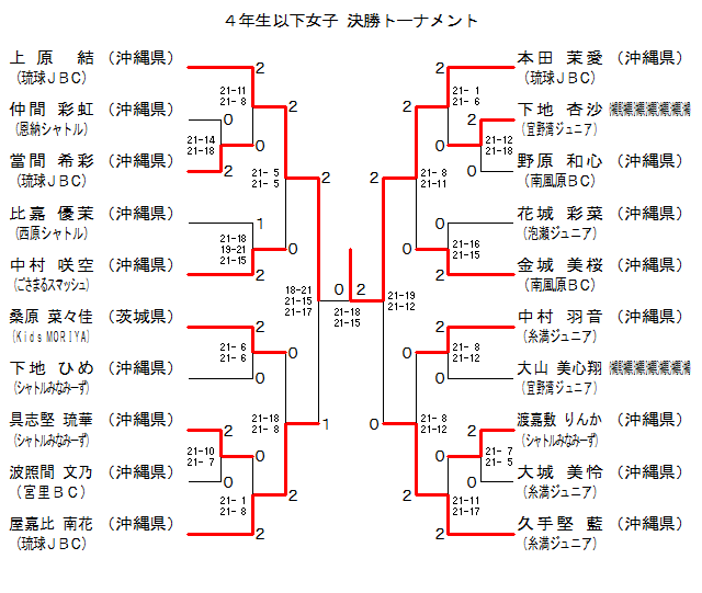 | 4GS-9 | 琉球JBC[沖縄県] | 本田 茉愛 | 2 | 21- 1 21- 6 | 0 | 下地 杏沙 | 宜野湾Jr.[沖縄県[沖縄県[沖縄県[沖縄県[沖縄県[沖縄県[沖縄] | |