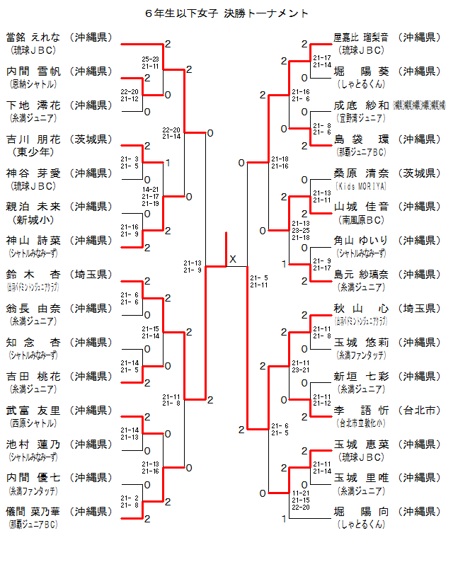 | 6GS-19 | 琉球JBC[沖縄県] | 屋嘉比瑠梨音 | 2 | 21-16 21- 6 | 0 | 島袋 環 | 那覇Jr.BC[沖縄県] | |