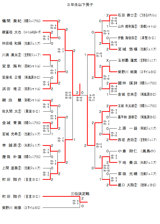| 3BS-24 | 那覇Jr.BC | 儀間 葵紀 | 2 | 15- 7 15- 7 | 0 | 浜田 堆正 | 西原シャトル | |