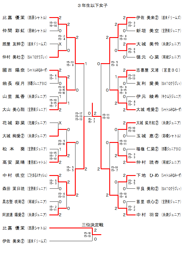 | 3GS-19 | 豊見城シャトル | 高安 菜晴 | 2 | 15- 5 20-18 | 0 | 大城絢愛A | 糸満Jr. | |