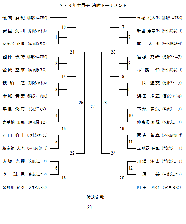 | 2・3年生男子 Eブロック | 石田 | 仲宗根 | 安里 | 新里 | 順位 |